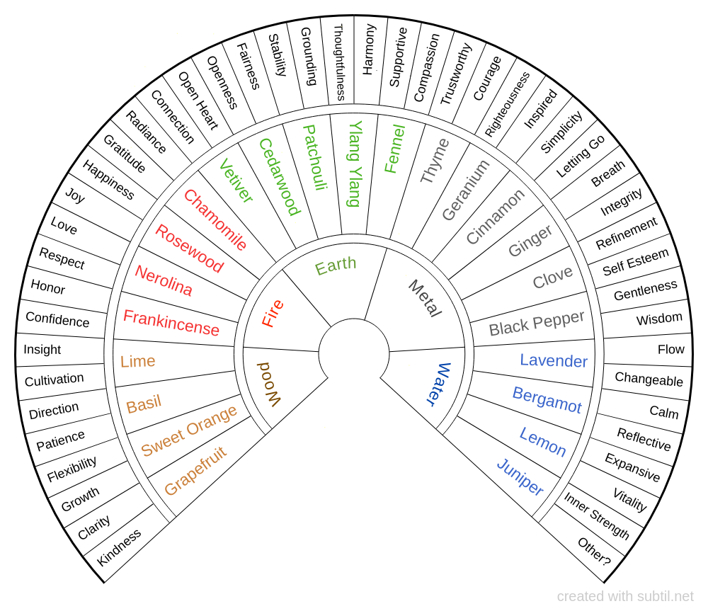 Essential Oils chart — use to check and create blends to balance emotional states and elements.