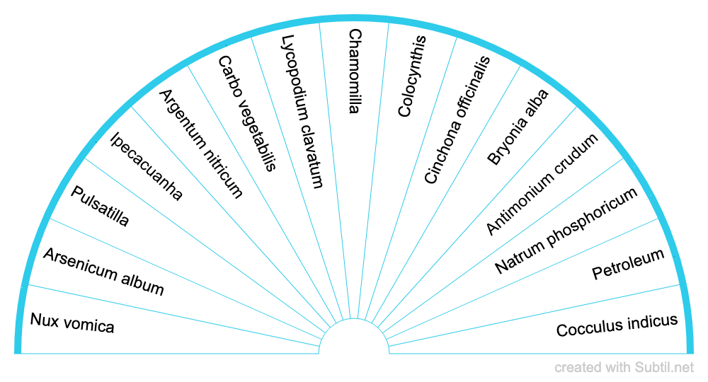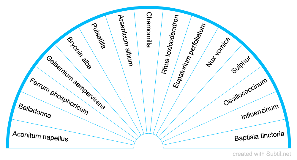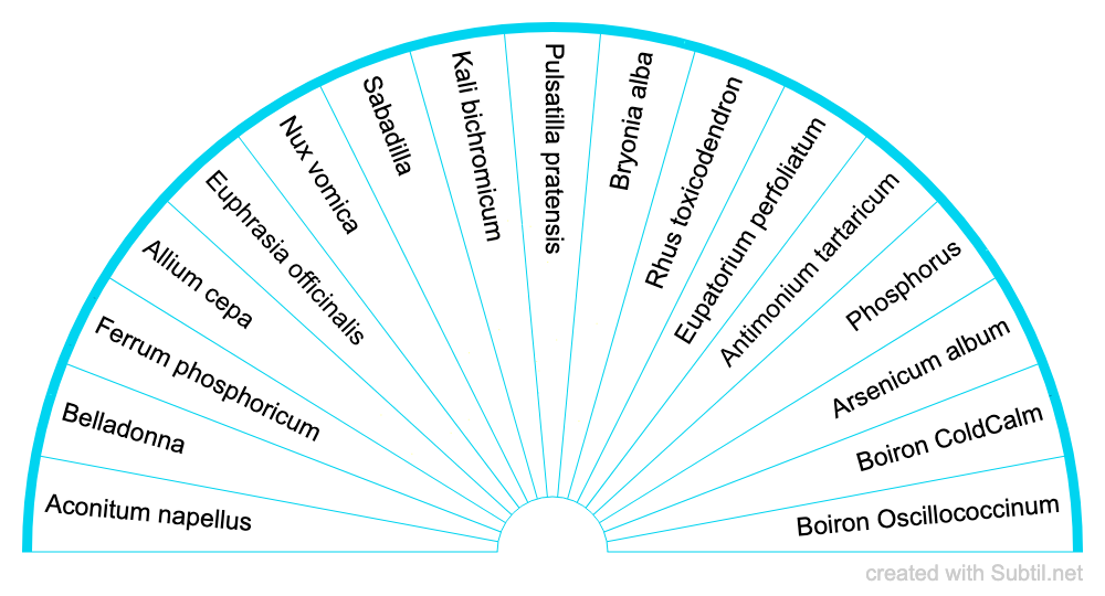 Most commonly used homeopathic remedies for the common cold. May need to use more than one.