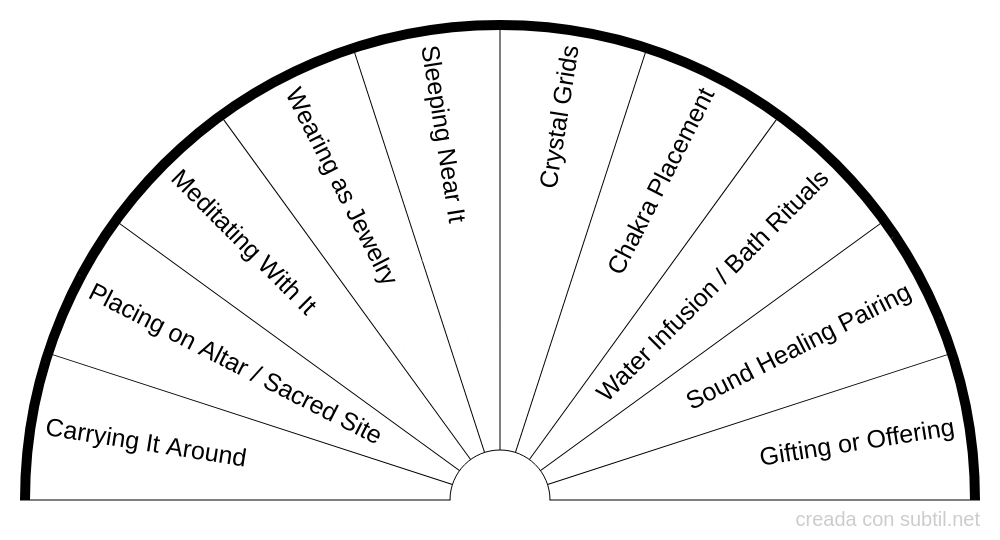 This chart offers intuitive ways to work with healing stones in daily life, ritual, and energetic alignment. Each method invites a unique relationship with the stone’s energy — whether through physical contact, sacred placement, or vibrational intention. Use your pendulum to discover how a stone wants to serve you and where it belongs in your energetic field.