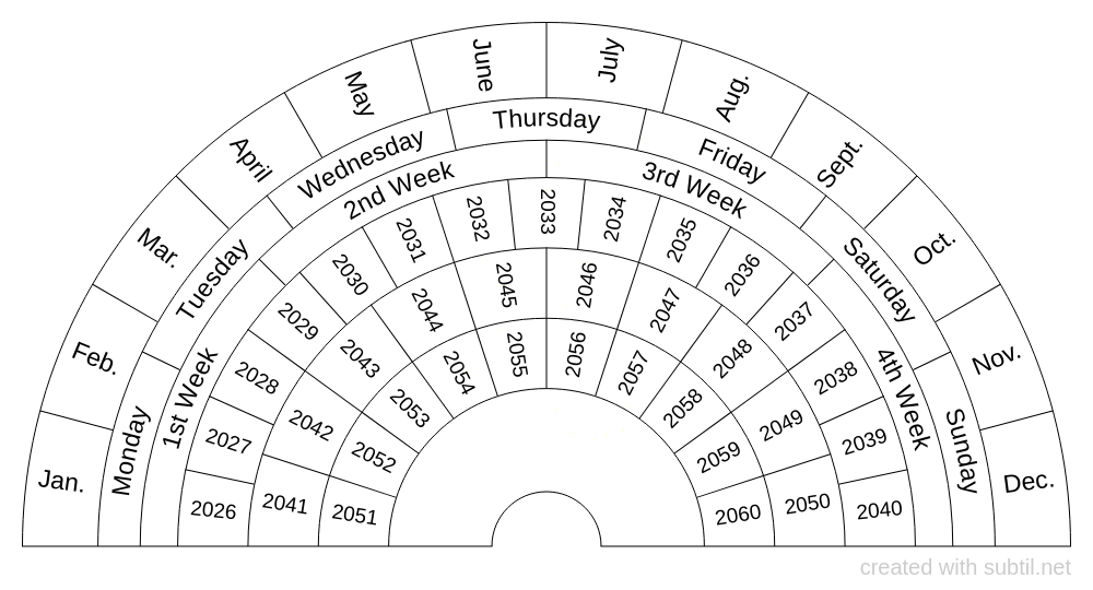 Months, days, weeks and years chart. 2026 through 2060.