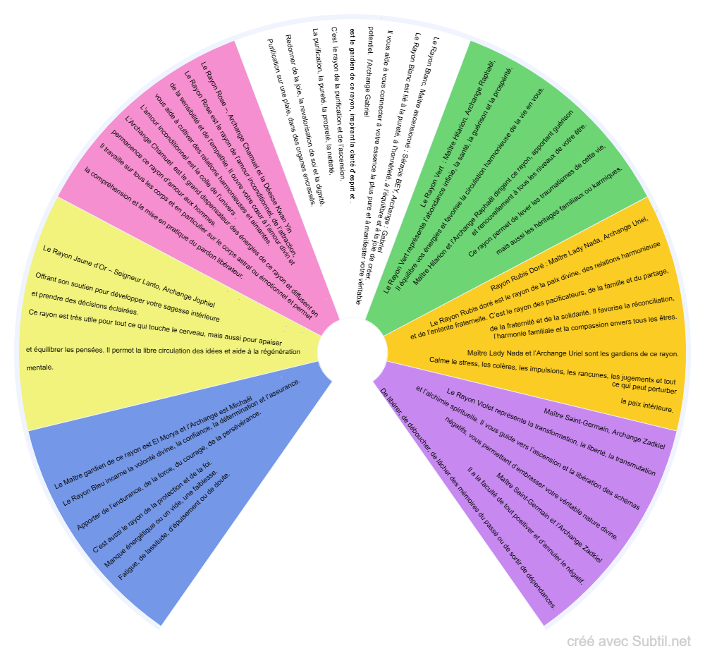 Les 7 Rayons Sacrés sont des manifestations puissantes de l’énergie divine qui se déploient à travers notre réalité. Chaque rayon possède des attributs uniques, des archanges qui les dirigent et des couleurs qui leur sont associées. Découvrons maintenant les 7 Rayons Sacrés et leurs influences spécifiques :