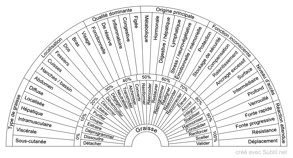 Les planches qui suivent sont dans le même thème que la planche «Graisse», elles vous apporteront des réponses complémentaires pour approfondir votre recherche au pendule.