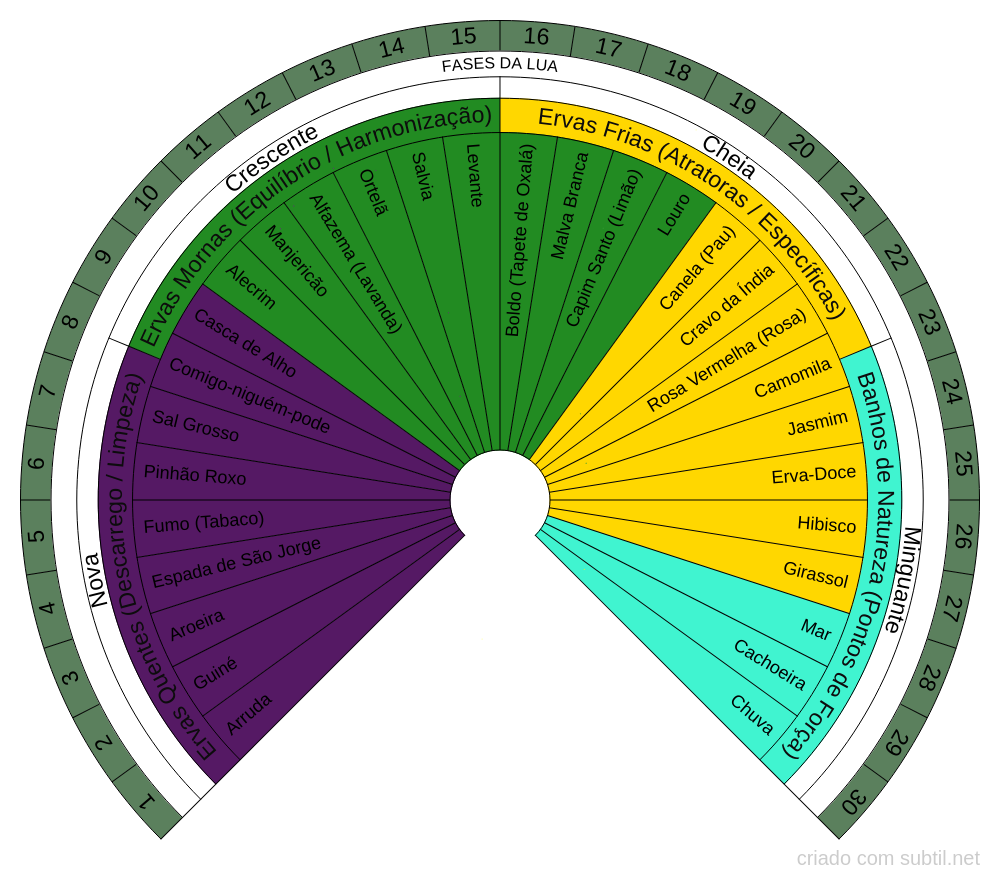 • Fases da Lua: Identifica qual o melhor momento lunar (Nova, Crescente, Cheia ou Minguante) para potencializar a intenção do banho.