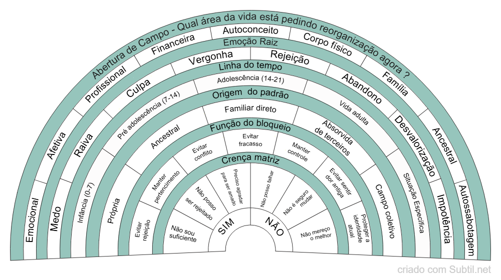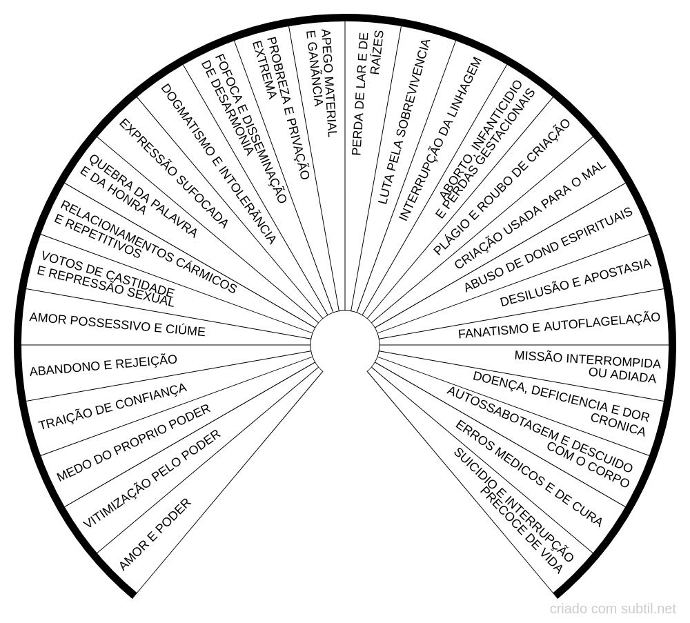 Poder e autoridade/ amor e relacionamentos / comunicação e verdade / sobrevivencia / criatividade e legado/ espirituais e de missão / saude e intedridadae do corpo