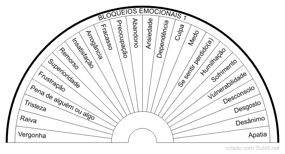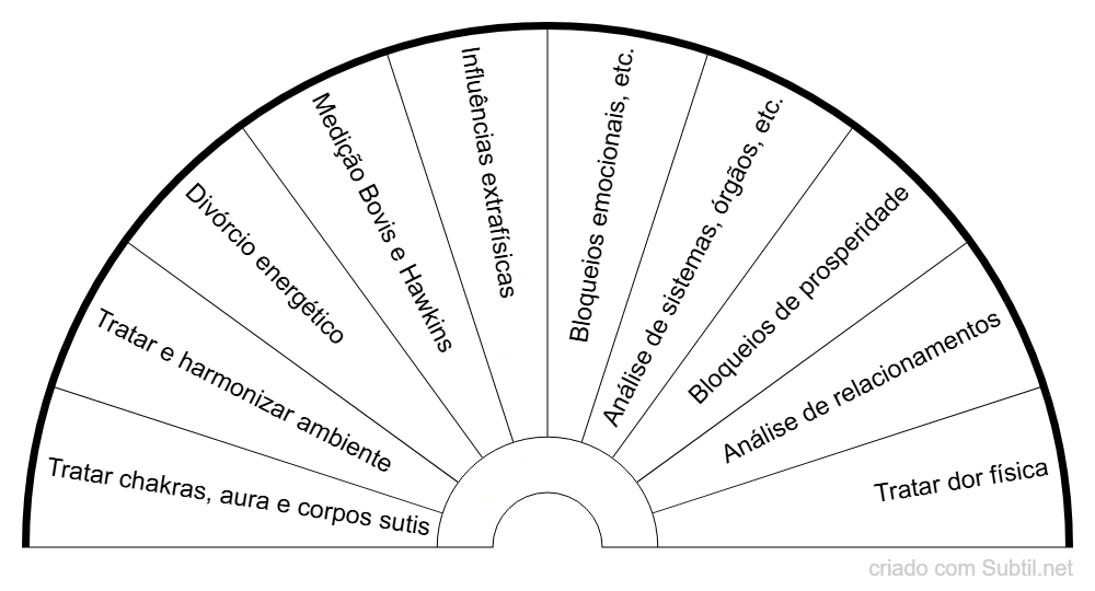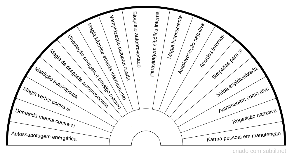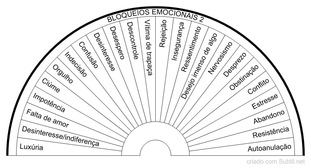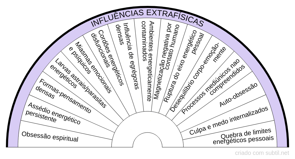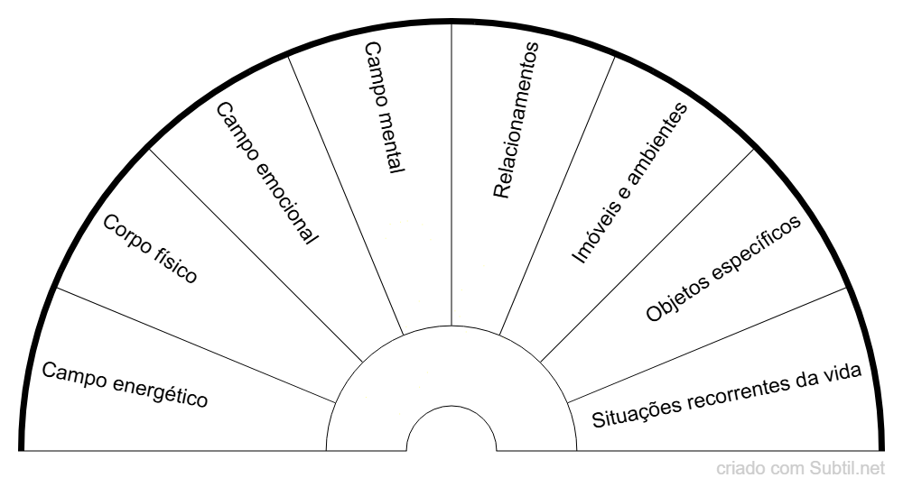 • Campo mental – interfere em pensamentos repetitivos, crenças limitantes, autossabotagem, expectativas negativas constantes