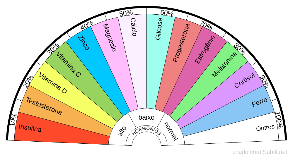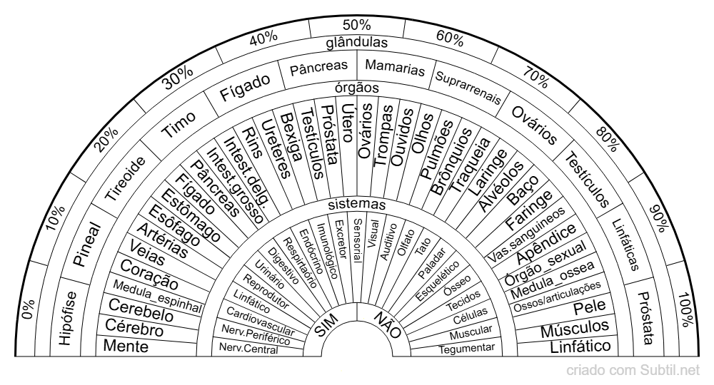Modo de uso: Posicione o pêndulo sobre o centro do biômetro, formule a pergunta mentalmente (ex.: “Qual trava mental está atuando neste momento?”) e aguarde o movimento indicar o campo correspondente.