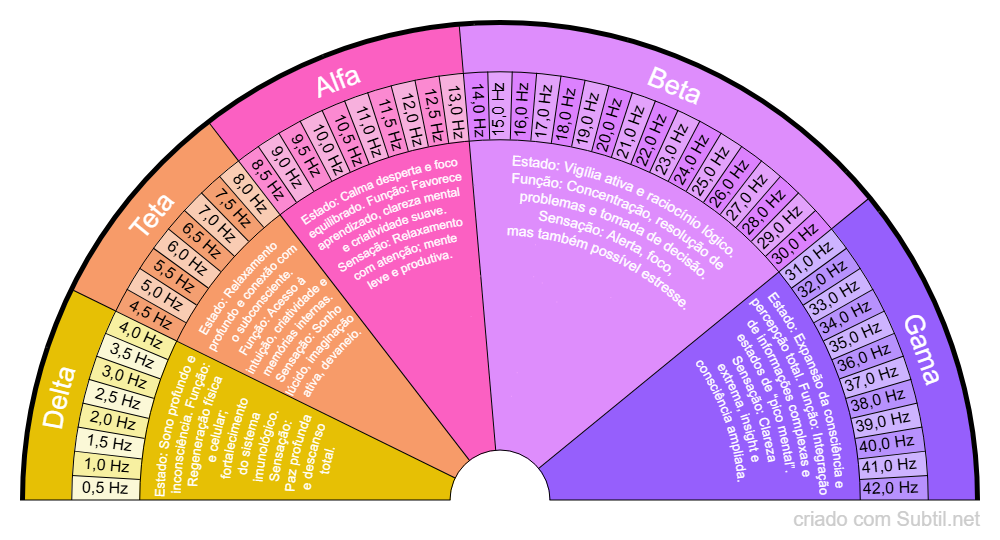 Estado: Relaxamento profundo e conexão com o subconsciente. Função: Acesso à intuição, criatividade e memórias internas. Sensação: Sonho lúcido, imaginação ativa, devaneio.